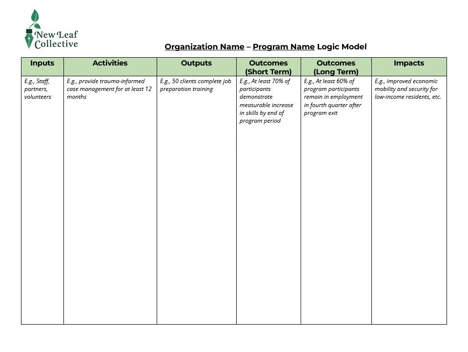 Logic Model Template – A fillable, visual framework to map your organization’s inputs, activities, and impact—ideal for attaching to proposals and sharing with funders.